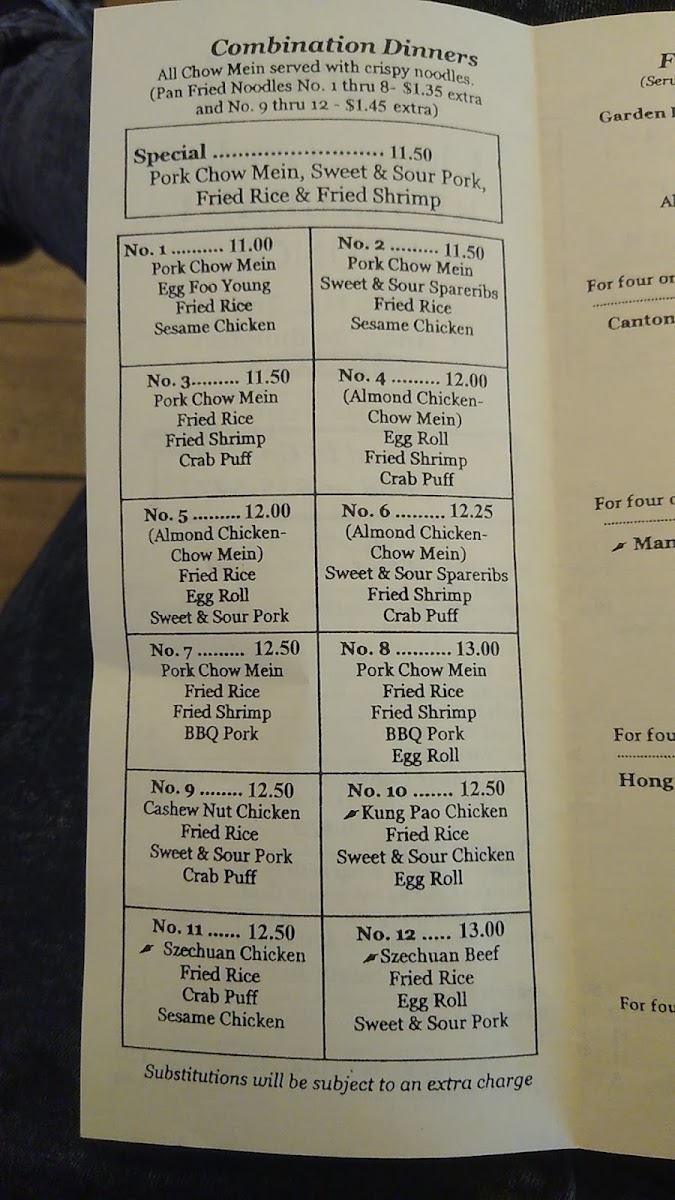 Soup, egg roll, crab puff, BBQ pork, almond chicken chow mein, sweet and sour pork, egg foo young, fried rice.for four or more people-add Sesame Chicken